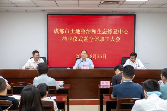 日前,成都市土地整治和生态修复中心举行挂牌仪式并召开全体职工大会。市规划和自然资源局党组书记胡斌同志、副局长张佳同志出席仪式和大会,并为成都市土地整治和生态修复中心揭牌。