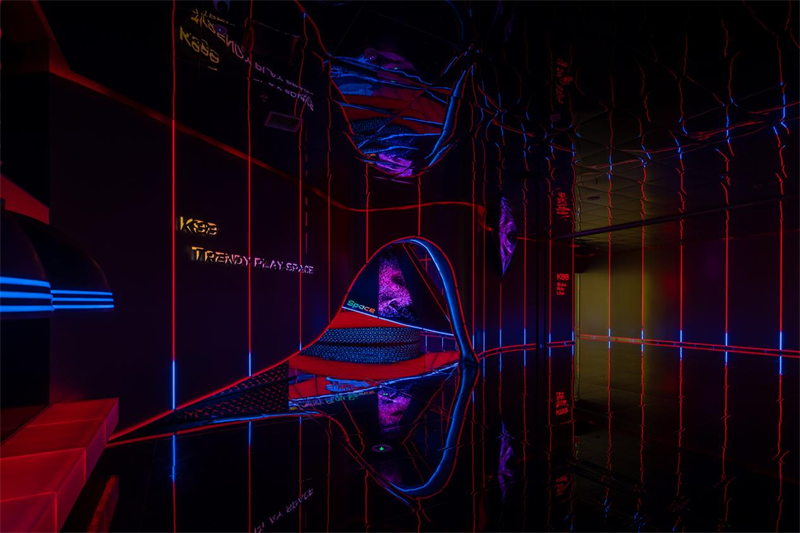 在K99潮玩的公区,有许多可供打卡的小心思,譬如,拉链设计的酒柜展示、像领带的光影画,整个公区还有很多弧形设计,相对比棱角分明的直线线条,弧形柔化了尖锐感,多了些圆润温和,在光影的配合下,呈现出了不一样的高级感。