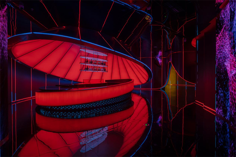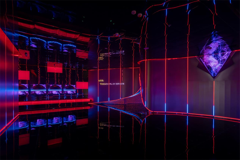 K99潮玩,还把光影运用到极致。从吧台到包间,你会经过一个拥有智能烟雾机搭配多元灯光模式的过道,直接把普通的过道打造成秀场。